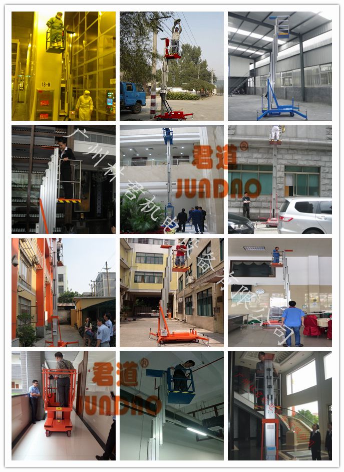 單柱鋁合金升降機:該系列產(chǎn)品為室內(nèi)型,廣泛適用于酒店,大型超市等各行業(yè)大廳、廠房內(nèi)的高空作業(yè),具有升降平衡,操作方便,能進入一般門廳,可隨意進出電梯且耗電少、、工作時不傷 地面,可用于貼墻工作及探出作業(yè),工作無死角。單立柱式鋁合金電動升降機配上龍門跨架附件,非常適合于影劇院、會堂、教堂等的維修工作。該龍門跨架組裝容易,操作省力,移動靈活,可跨越高度達1.1m的固定座椅等障礙物,并可在臺階上穩(wěn)定作業(yè)。 高強度矩形鋼管制作, 剛性、穩(wěn)定性好。配有萬向腳輪,機動靈活。 兩端架跨距可調(diào),能適 用于跨越不同障礙物的要求。 兩端架垂直可調(diào),可用于一定坡度的斜面或臺階上作業(yè)。
