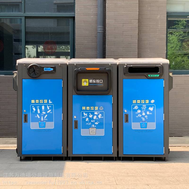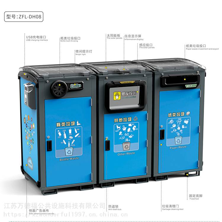 本次投放的智能垃圾桶具有紙類滅火、智能壓縮、太陽能供電、USB充電等多功能,藍(lán)色外觀,瓶類垃圾、其他垃圾和紙類垃圾單投放,其他垃圾箱體內(nèi)置感應(yīng)模塊,當(dāng)手靠近設(shè)備投口時(shí),擋板自動(dòng)開啟;紙類垃圾箱體具有自動(dòng)壓縮功能,當(dāng)垃圾達(dá)到一定的量,垃圾自動(dòng)被壓縮。每個(gè)箱體容量120升,整體容量346L。