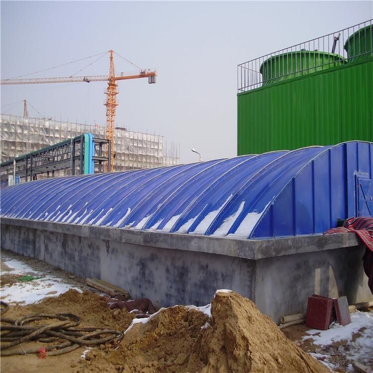 玻璃鋼污水池蓋板裝置工藝流程為:堆積就位——搭接固定——調(diào)整查驗——裝置并固定——密封——清理檢修