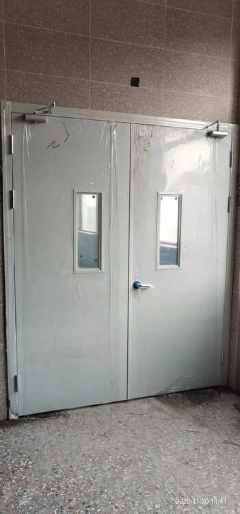 雙扇門(mén)間帶有蓋縫板,并裝有閉門(mén)器門(mén)框裝有密封槽,槽內(nèi)鑲嵌由不燃性材料制成的密封條。