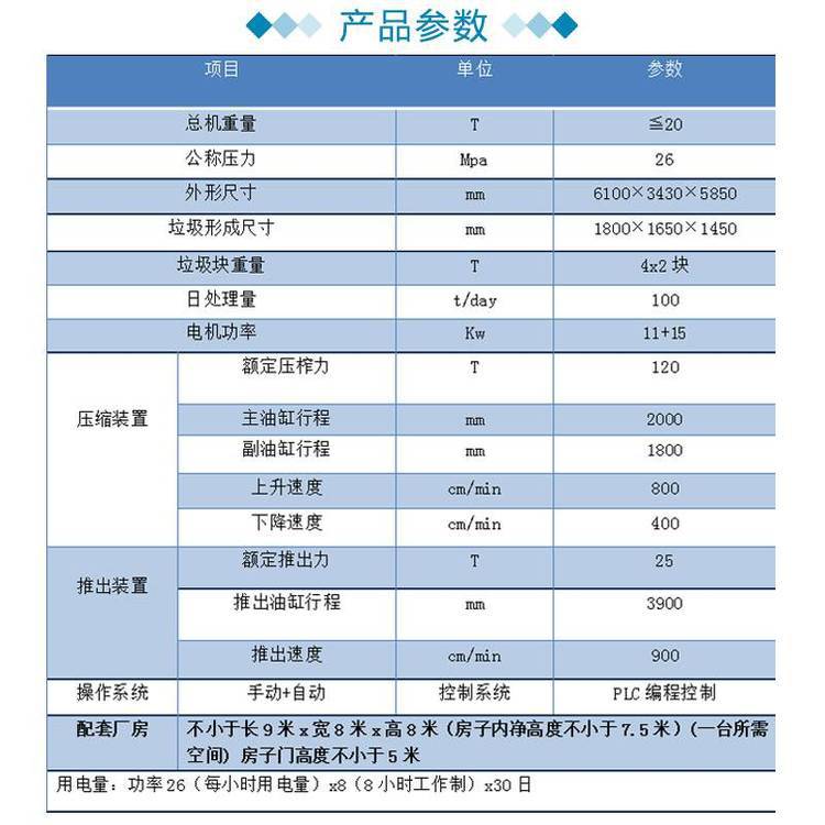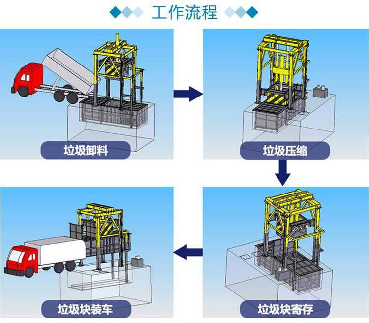垂直式轉(zhuǎn)運站垃圾壓縮設(shè)備采用直接投料方式進行收集生活垃圾,即人力手推車、垃圾收集車、3噸以下小型機動車等,采用垂直壓縮工藝的方式進行壓縮處理,一臺垂直式垃圾壓縮機可以壓縮兩塊垃圾,每塊為四立方,總共為8立方,使用10噸壓縮式垃圾轉(zhuǎn)運車(勾臂式垃圾車、全封閉)進行轉(zhuǎn)運的模式。此轉(zhuǎn)運站在滿足轉(zhuǎn)運能力的基礎(chǔ)上,可有效減小生活垃圾轉(zhuǎn)運成本及轉(zhuǎn)運站的土建建設(shè)成本。