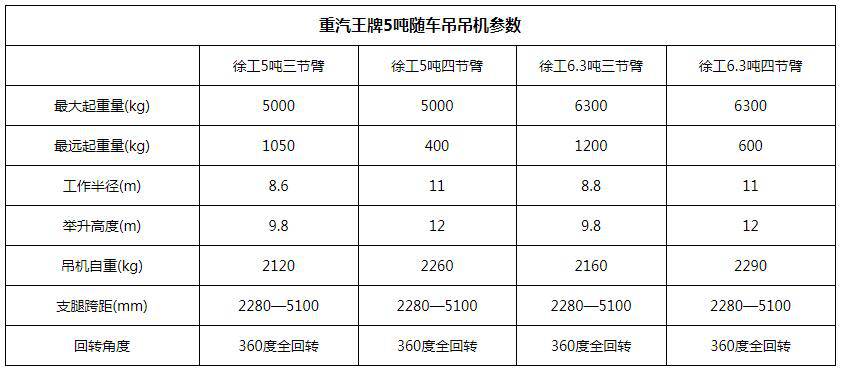 重汽隨車吊底盤3.9米軸距常配5噸,6.3噸吊機(jī),4.5米軸距常配5噸,6.3噸,8噸吊機(jī),吊機(jī)品牌可選三一,徐工,石煤等,360度全回轉(zhuǎn),標(biāo)配前液壓支腿,后支腿可以選擇固定或單腔液壓后支腿。