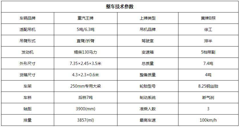 配置1:重汽5噸隨車吊采用重汽底盤,2080mm駕駛室,錫柴130馬力發(fā)動(dòng)機(jī),國(guó)五排放標(biāo)準(zhǔn),5檔帶副變速箱,7噸后橋,250mm大梁,全車8.25鋼絲胎,3.9米軸距;