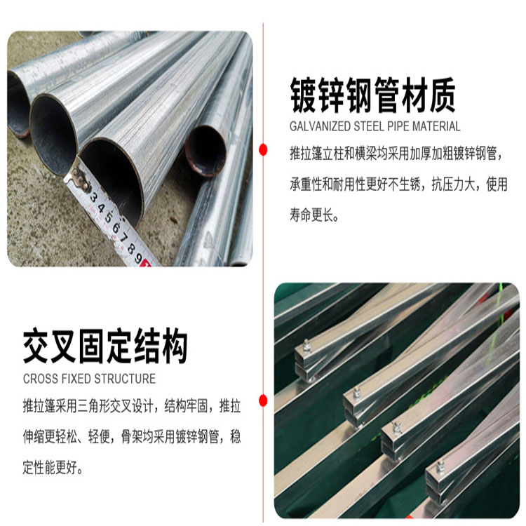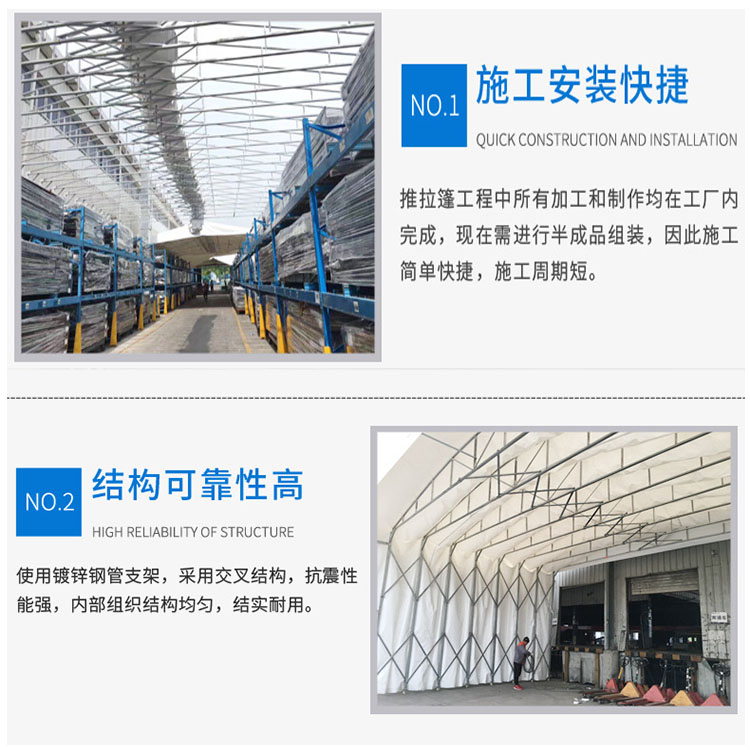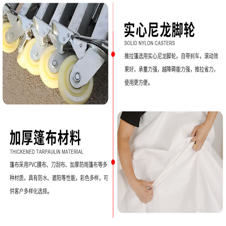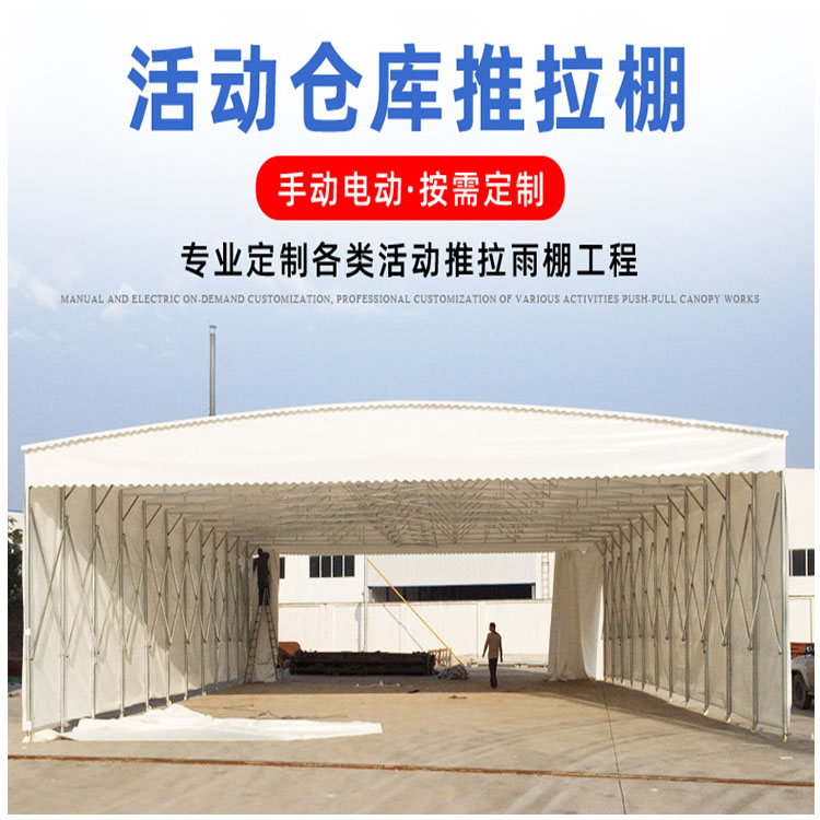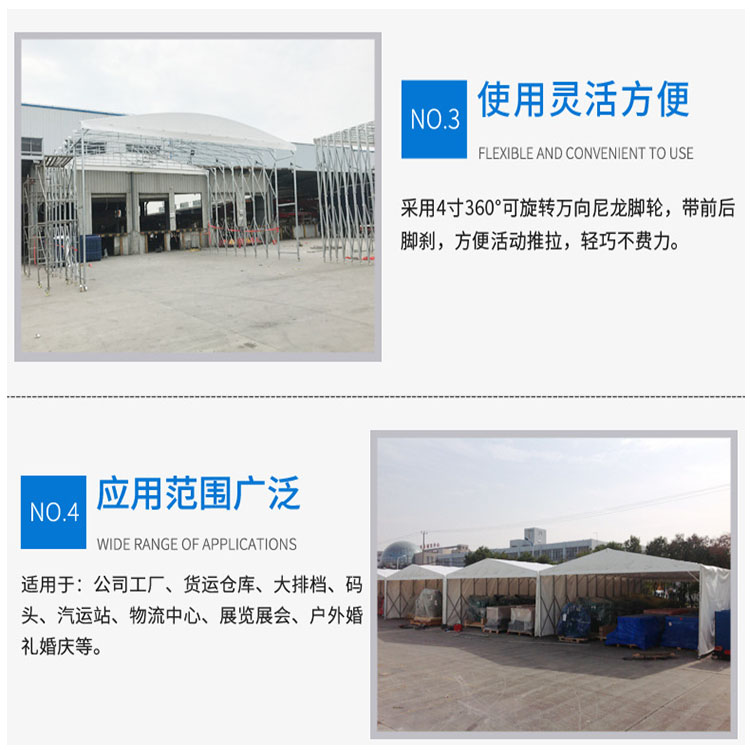 產(chǎn)品名稱:活動伸縮篷,推拉雨棚篷布材質(zhì):PVC雙面涂層防雨布、阻燃布支架材質(zhì):鍍鋅鋼管產(chǎn)品規(guī)格:尺寸大小按需定做腳輪:萬向輪(按定制尺寸配置輪子)產(chǎn)品特點:可移動,可伸縮,四周可封閉也可打開。使用不占空間,遷移方便,操作簡單,可根據(jù)需要進(jìn)行反復(fù)的拆裝使用;篷布強(qiáng)度高,延展性好,柔韌性強(qiáng)。和耐嚴(yán)寒。防雨,耐曬,耐刮,耐拉;支架是熱鍍鋅管,衛(wèi)生。產(chǎn)品用途:商業(yè)展銷、節(jié)日慶典、餐飲娛樂、企業(yè)倉庫倉儲、移動倉庫、戶外停車場、物流倉儲、戶外休閑、便民市政等等,各種戶外臨時活動均有用武之地,按尺寸定做。