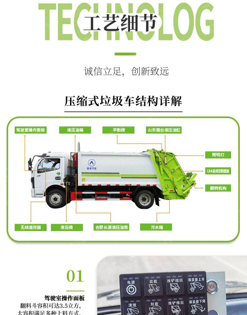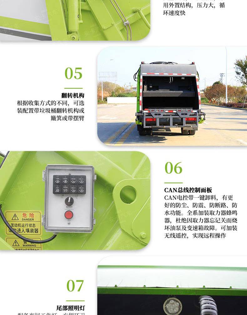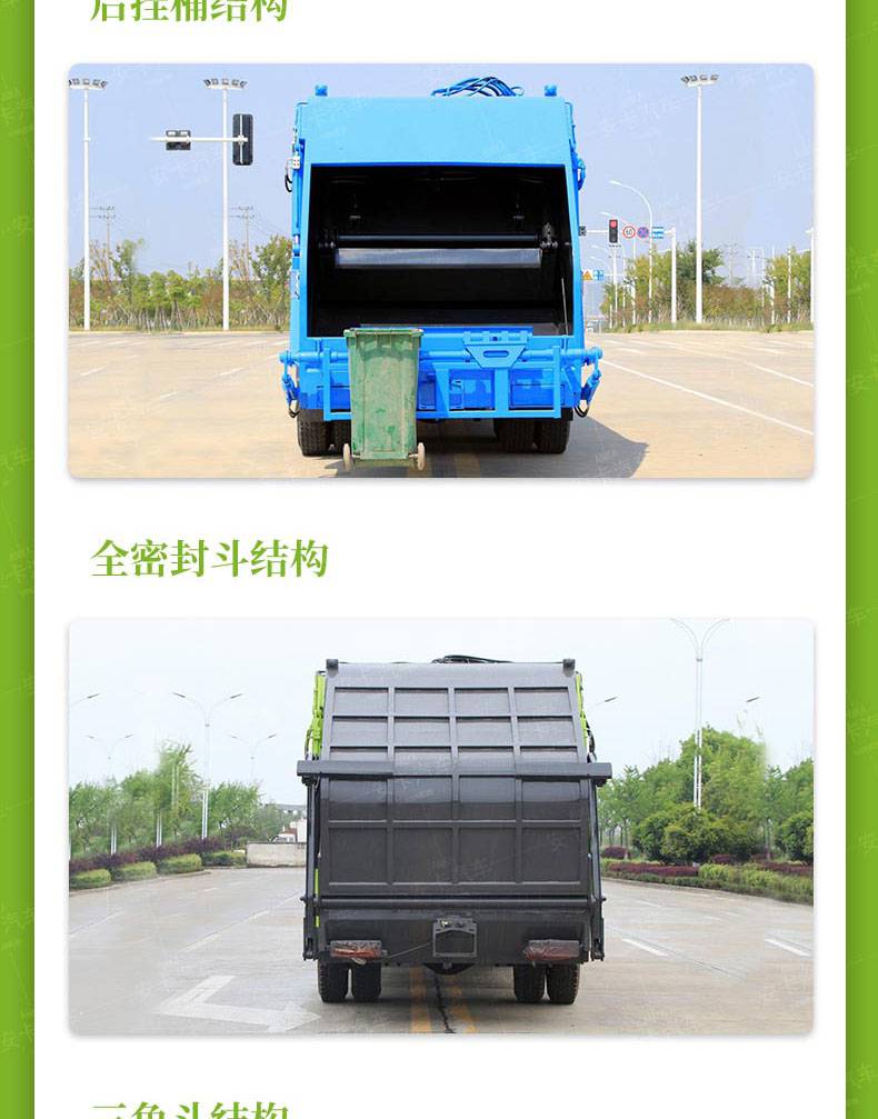 程力6方壓縮式垃圾車整車由東風(fēng)底盤,6方弧形箱體組成,通過液壓系統(tǒng),電氣系統(tǒng)控制實(shí)現(xiàn)整車的功能操作,整體外形美觀,上裝部分由密封式垃圾箱、填裝器組成。整車為全封閉型,采用電氣液一體化技術(shù),借助機(jī)、電、液聯(lián)合自動(dòng)控制系統(tǒng),通過垃圾箱、填裝器和推鏟等裝置,實(shí)現(xiàn)垃圾倒入、壓碎或壓扁、強(qiáng)力裝填,把垃圾擠入車廂并壓實(shí)和推卸。壓縮過程中的污水全部進(jìn)入污水廂,解決了垃圾運(yùn)輸過程中的二次污染的問題。