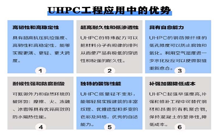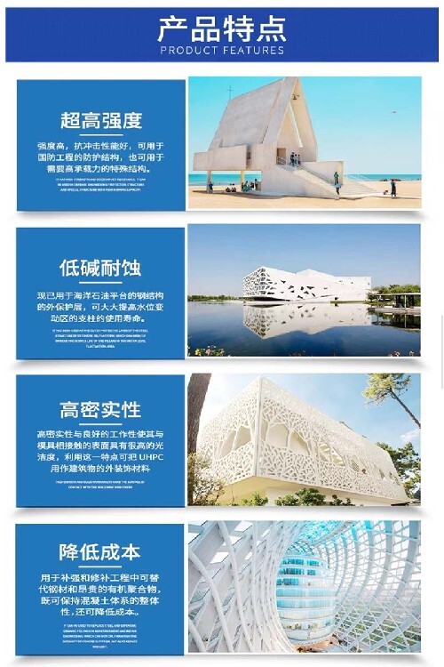 中德新亞? UHPC性能混凝土的適用范圍: 1、用于大跨徑梁板、限制尺寸構(gòu)件的制作; 2、公路、鐵路面鋪裝以及維修加固; 3、制造輸油、輸氣管道,以砼代鋼降低生產(chǎn)和運營成本; 4、高強度掛板、蓋板、裝飾構(gòu)件、混凝土工藝品等 5、制造中低核廢料貯存容器; 6、領(lǐng)域安防、抗爆工事; 7、各類加固補強工程。