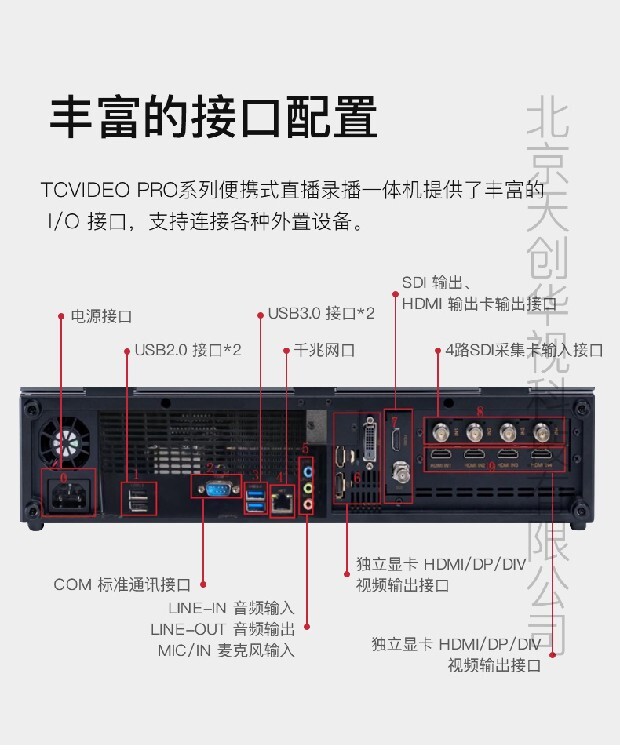 TCVIDEO PRO融媒體演播室直播一體機的價格相對于其他的直播一體機來說,價格是比較便宜的, 切換臺的通道也比較多,使用起來比較方便。 機箱的設計也很細心,新增了防撞擊護角,可以很好的保護設備。