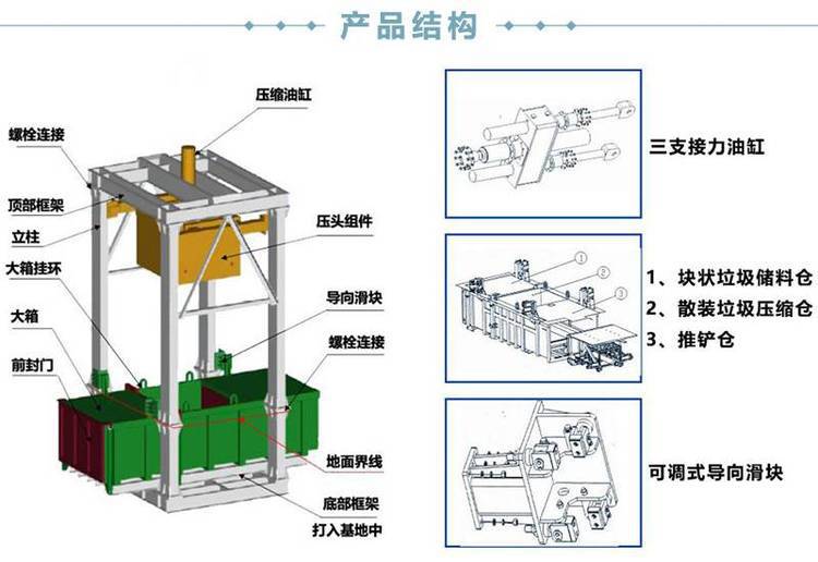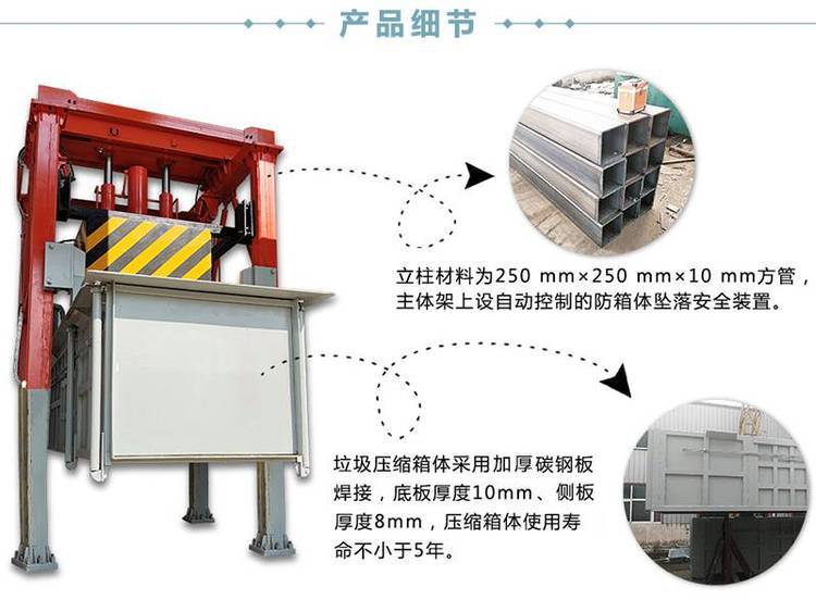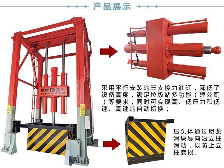 壓縮裝置:是垂直轉運站垃圾壓縮箱的主體,由鋼框架、壓頭、壓頭導向裝置及液壓油缸組成,通過壓縮油缸的上下運行實現對垃圾進行壓縮處理工作、提升垃圾箱體總成等工作,它的壓縮力為100噸。