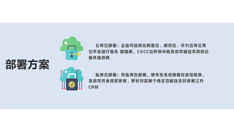 公有云部署:企業(yè)可選擇在阿里云、騰訊云、華為云等公有云平臺進行服務器租用,CXCC云呼叫中心系統(tǒng)可適應不同的云服務提供商