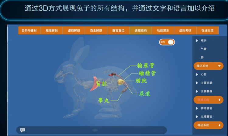 本系統(tǒng)利用3D建模技術(shù)將兔子的形態(tài)結(jié)構(gòu)逼真再現(xiàn),包括外部結(jié)構(gòu),內(nèi)臟結(jié)構(gòu),口腔等。然后利用實(shí)時渲染技術(shù)以及動畫技術(shù)將兔子的解剖過程進(jìn)行模擬,學(xué)生可以借助計算機(jī)外部設(shè)備與動畫和模型互動,模擬真實(shí)的解剖過程。并對學(xué)生的操作進(jìn)行實(shí)時考試和評價。