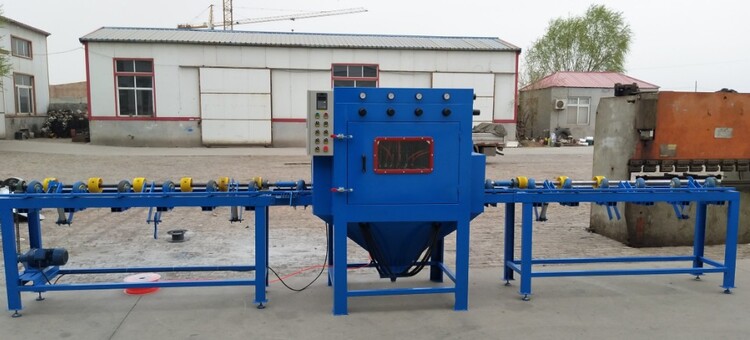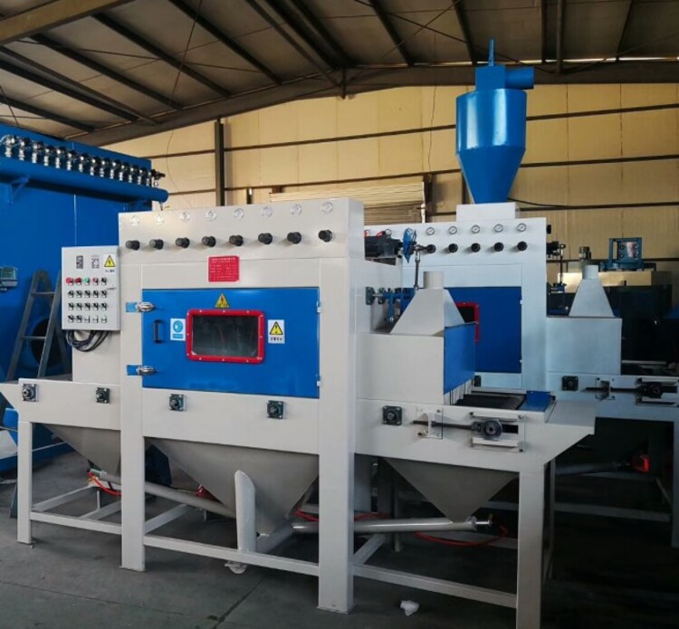 輸送式噴砂機配置:主機、輸送架、噴砂系統(tǒng)噴砂管、噴砂槍、碳化硼噴嘴、加壓罐、消音器、吹塵槍、噴砂服、噴砂手套、回砂系統(tǒng)除塵風機、除塵管道、除塵濾筒、回沙管道、旋風分離器和PLC控制系統(tǒng)等其它零配件。它可以依客戶需求訂制成普壓輸送式噴砂機和加壓輸送式噴砂機。