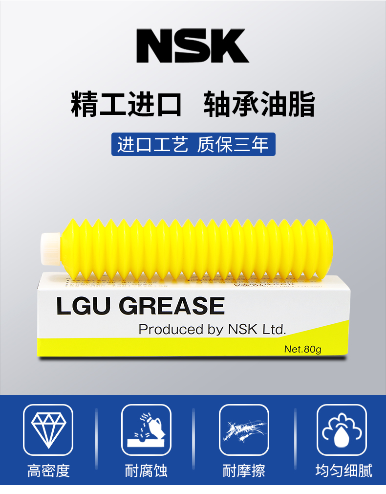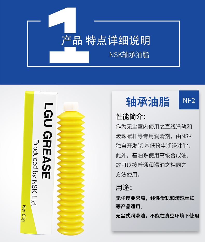 特 性:NSK LGU作為無(wú)塵室使用之直線滑軌和滾珠螺桿等潤(rùn)滑劑,NSK LGU潤(rùn)滑脂